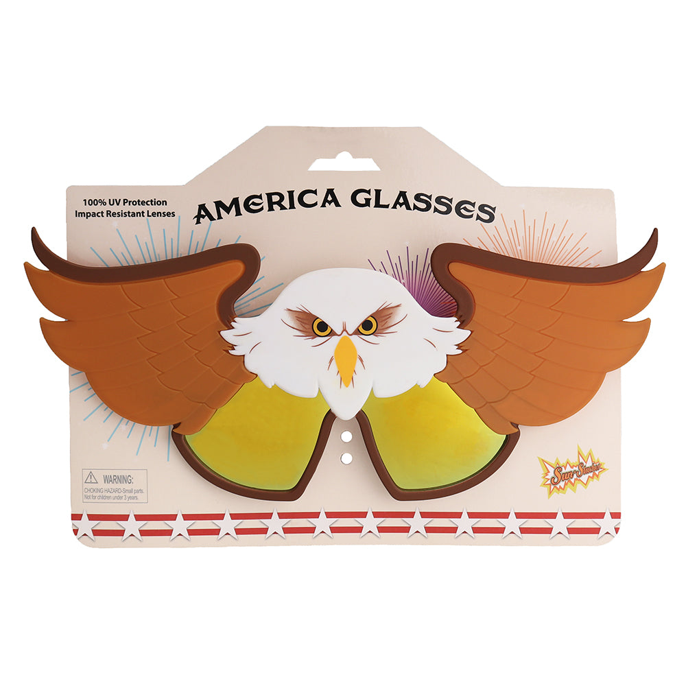 Flap your wings and soar the skies in a pair of Bald Eagle Sunglasses. Featuring a majestic eagle, these fun frames are great for all occasions, from costume parties to 4th of July parties. Complete with brown wings on a brown frame with UV protective lenses keeps your eyes safe while having fun outdoors. 🦅