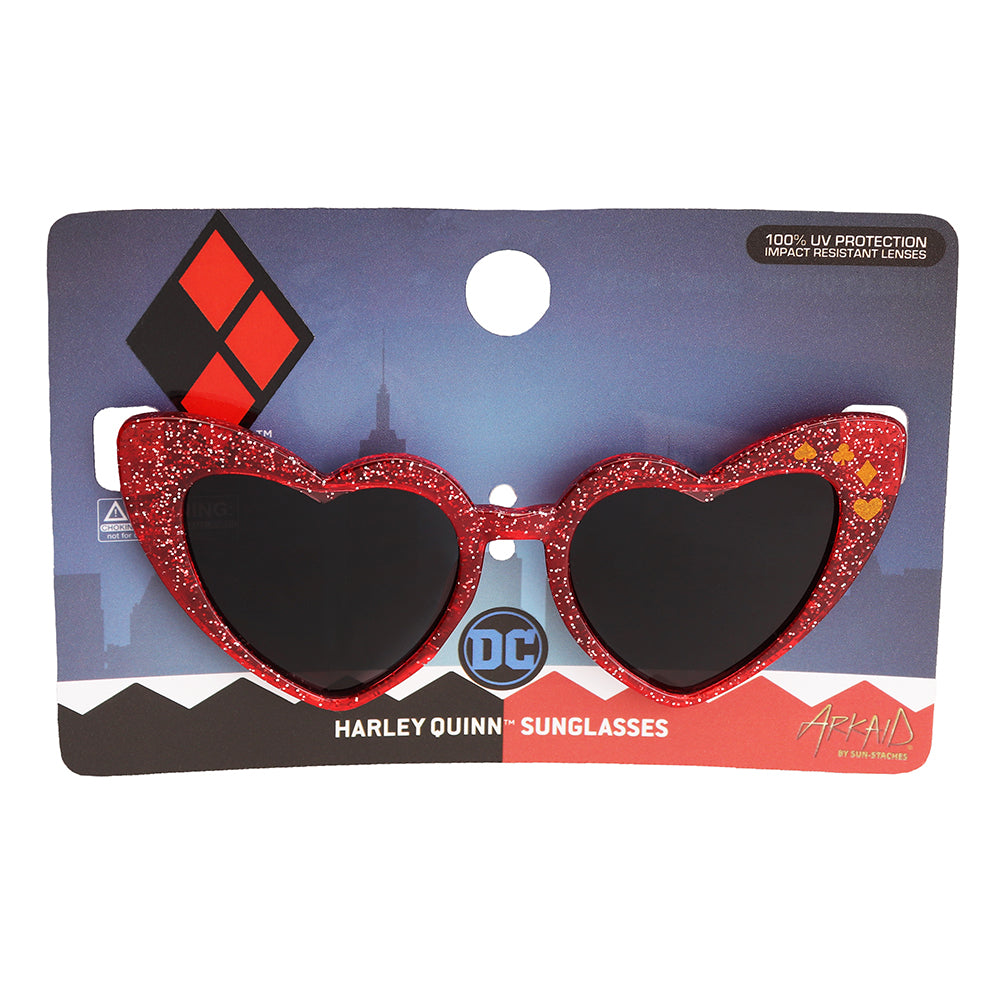 Become the Queen of Crime in Gotham with a pair of Harley Quinn sunglasses. Featuring a glittery red design that is equal parts cute and crazy. Complete with UV protective lenses and made for fun in the sun, these are perfect for comic book fans of all ages. Whether you're a supervillain or superhero, you're gonna look great with a new pair of entertaining eyewear. These aren't just sunglasses, they're Sun-Staches!