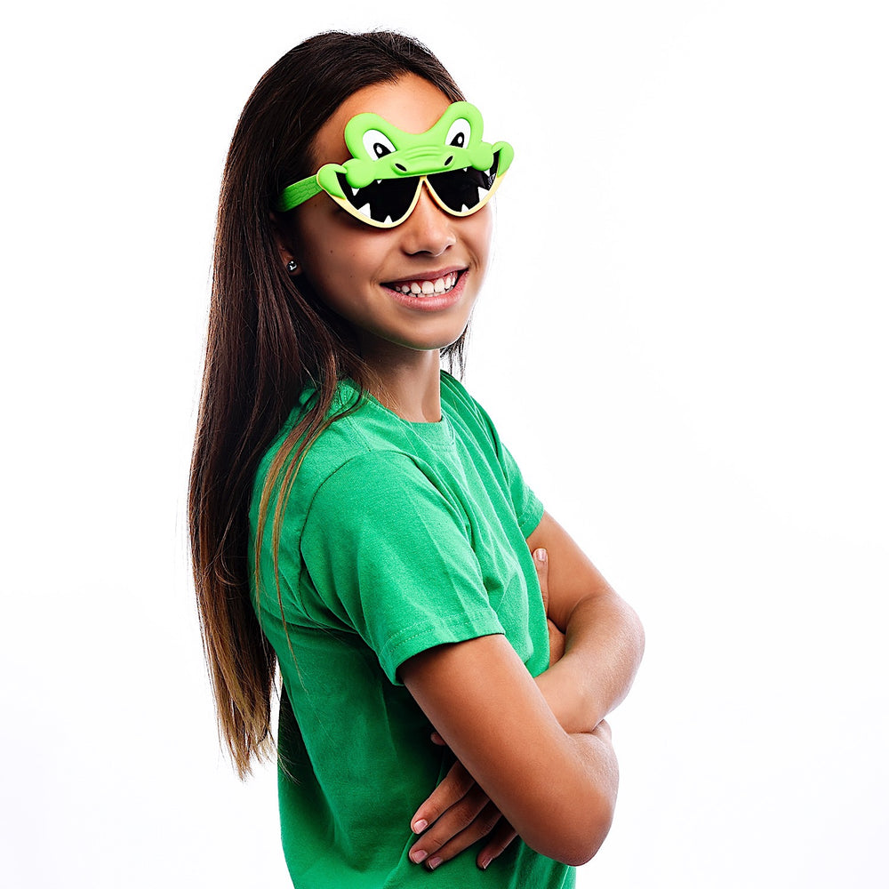 Smile big for the camera and show all of your 80 teeth in our Alligator Sun-Staches. Whether you're relaxing in the bayou or choosing the ultimate costume for the party, these entertaining eyeglasses are perfect for bringing the fun wherever you go. Full UV protection keeps your eyes safe from the the sun's harmful rays. Perfect for young gators and made for fun in the sun; these aren't just sunglasses, they're Sun-Staches!