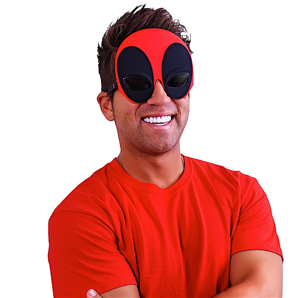 Become the ultimate merc with the mouth in our Deadpool Sun-Staches. Become the coolest Marvel anti-hero around and kick butt in while rocking Deadpool's signature red and black mask. Break the 4th wall in style and be the life of the party while keeping your eyes safe. Complete with UV400 protective and impact resistant lenses, these shades were made to take a beating and keep going. Perfect for heroes and villains of all ages and made for fun in the sun. These aren't just sunglasses, they're Sun-Staches!