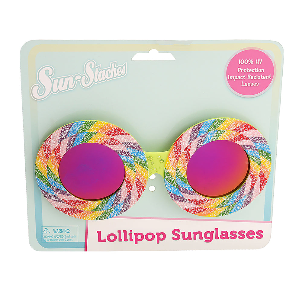 Treat yourself with a Lollipop Sun-Staches and be the sweetest thing around. Featuring rainbow lollipop frames and glitter these are perfect accessory to add a touch of sweetness to your outfit. UV protective lenses keep your eyes safe so you can have fun in the sun. Great for all ages and occasions. These aren't just sunglasses, they're Sun-Staches!