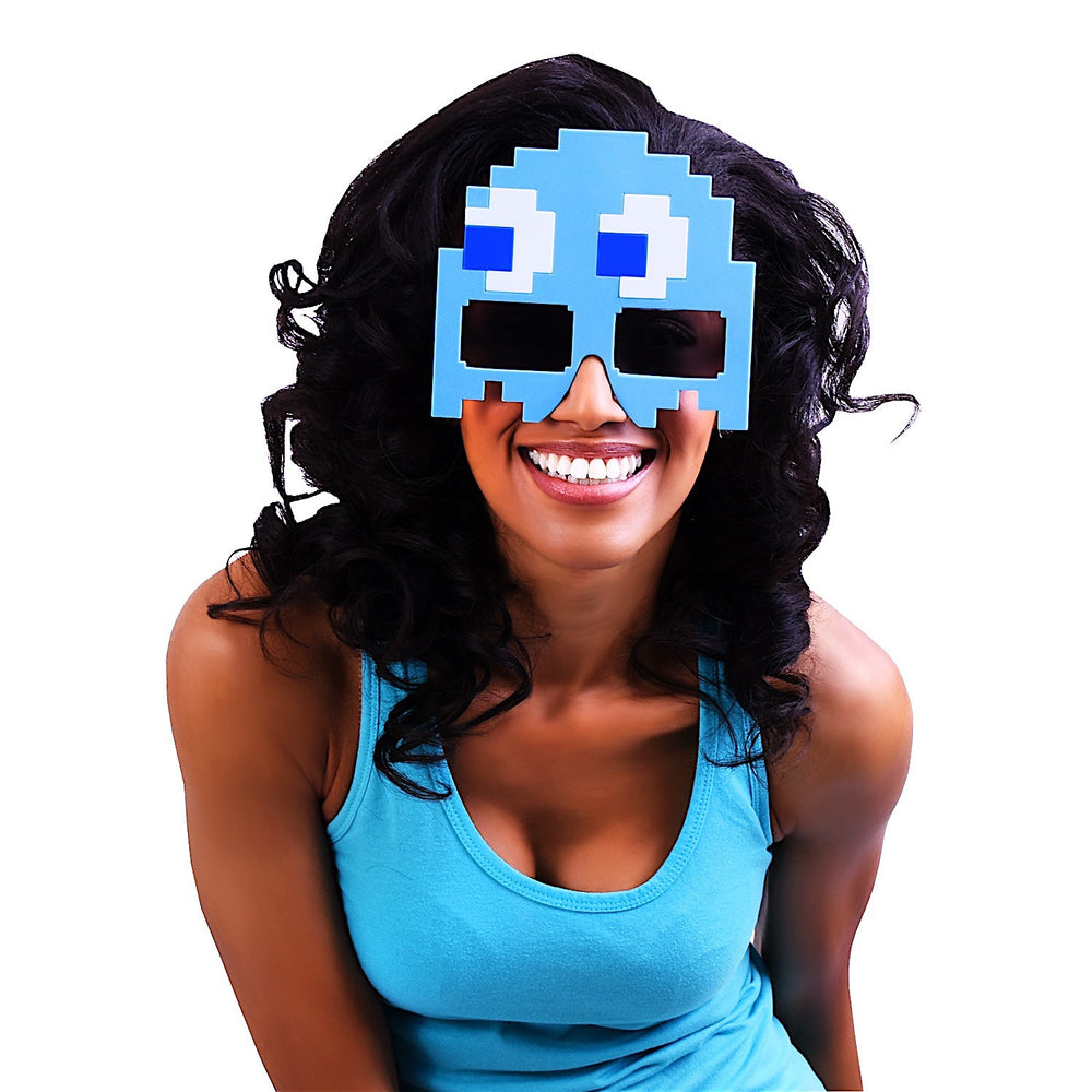 Catch and spook Pac-Man as a blue ghost with this pair of Bashful Sun-Staches, just watch out for when he eats that blinking dot. Show off your retro gamer style with some entertaining eyewear. It's not game over, level up your style and be the hit at your nearby arcade. These aren't just sunglasses, they're Sun-Staches!